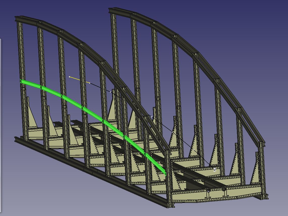 Der Mittelteil der Bogenbrücke entsteht wie das erste Drittel, Kopie der Langträger, anpassen auf eine Länge von 127mm, Kopien der Rippen, platzieren und kopieren der vertikalen Stützen. Verbinden der oberen Punkte, Kopieren des Profils des Obergurtes und erstellen und platzieren der Sweeps.